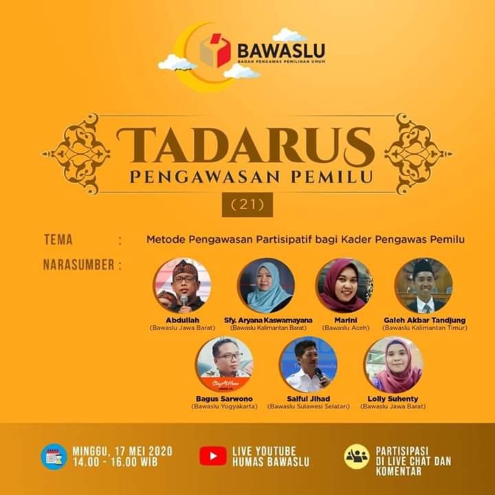 Kesemuanya membahas tema besar terkait Metode Pengawasan Partisipatif Bagi Kader Pengawas Pemilu, yang disiarkan secara online di channel youtube Bawaslu RI.
