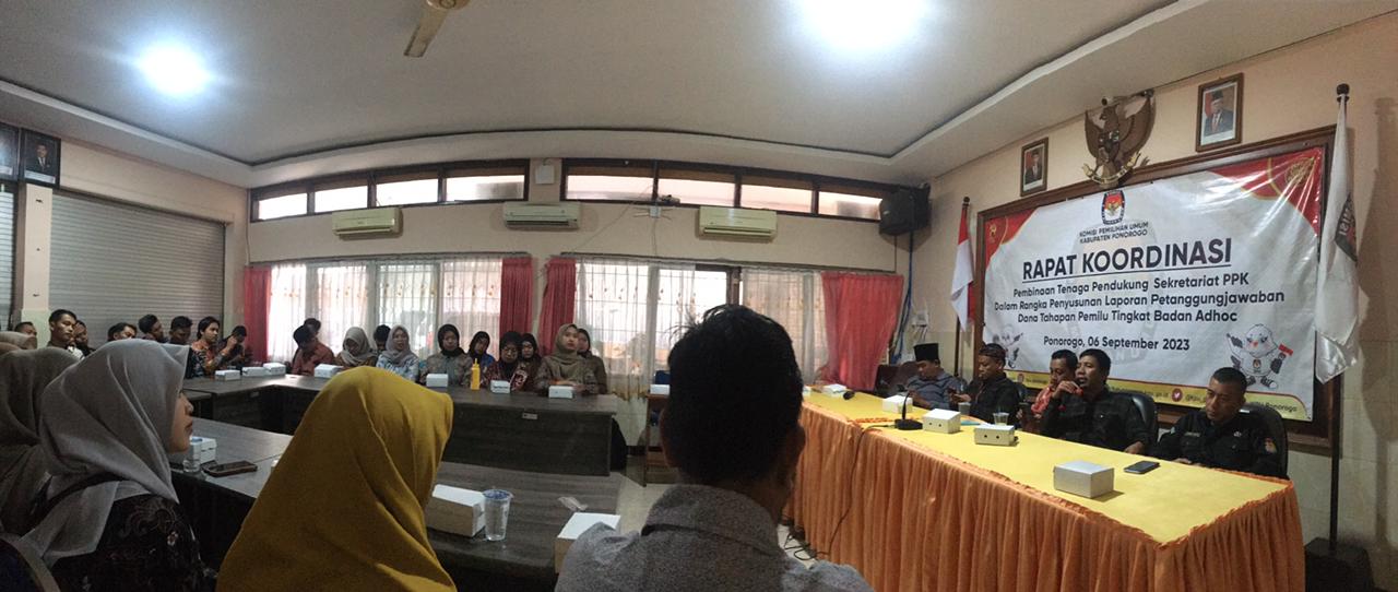 Kegiatan yang bertajuk Rapat Koordinasi Pembinaan Tenaga Pendukung Sekretariat PPK dalam Penyusunan Laporan Pertanggungjawaban Dana Tahapan Pemilu Tingkat Badan Adhoc tersebut diikuti oleh seluruh Tenaga Pendukung Sekretariat PPK se Kabupate Ponorogo. Kegiatan pengarahan tersebut berlangsung di Ruang Rapat Kantor Komisi Pemilihan Umum (KPU) Kabupaten Ponorogo pada hari Rabu (06 September 2023).