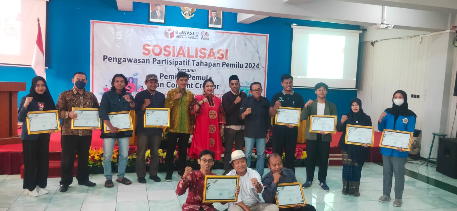 Ponorogo (ponorogo.bawaslu.go.id) Sejumlah 10 tim content creator bahan sosialisasi pengawasan partisipatif Pemilu tahun 2024 mendapat apresiasi dan anugerah penghargaan dari Badan Pengawas Pemilihan Umum (Bawaslu) Kabupaten Ponorogo Ponorogo.