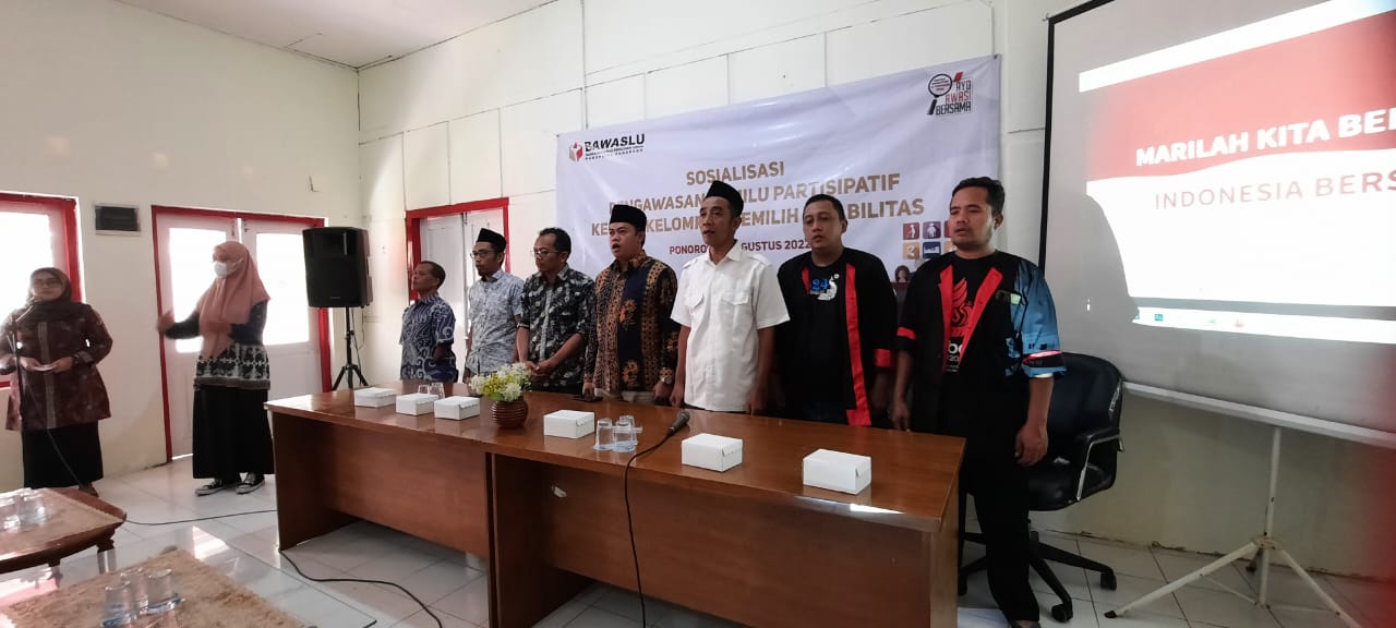 Sebagai informasi pada kegiatan Sosialisasi Pengawasan Partisipatif Bagi Kelompok Pemilih Disabilitas yang diselenggarakan oleh Bawaslu Kabupaten Ponorogo ini turut dilaksanakan penyerahan MOU dengan perkumpulan penyandang disabilitas dari Panti Asuhan Tunanetra Aisyiyah, Persatuan Tunanetra Indonesia serta Komite Paralimpiade Nasional Indonesia di Kabupaten Ponorogo. (Humas).