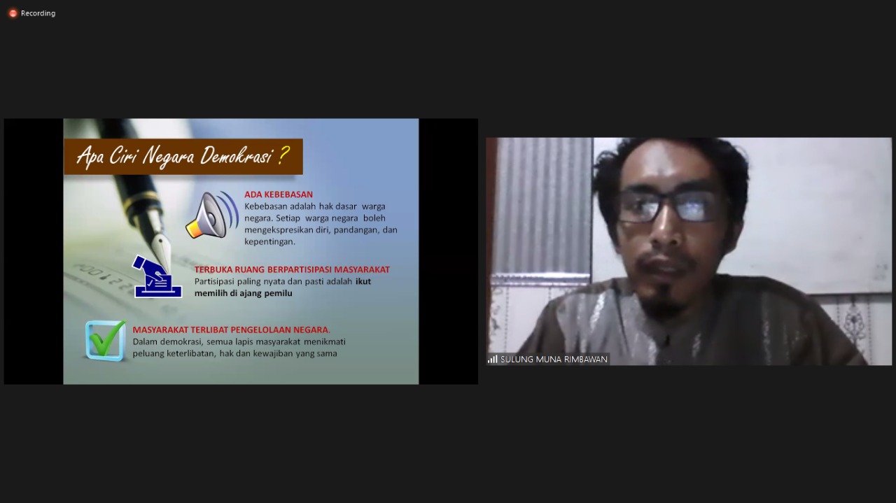 “Tantangan bagi demokrasi kita dimasa pandemi seperti sekarang, yakni seperti general distrust publik serta perang opini dan manuver (cyber army).” Ungkap Sulung.
