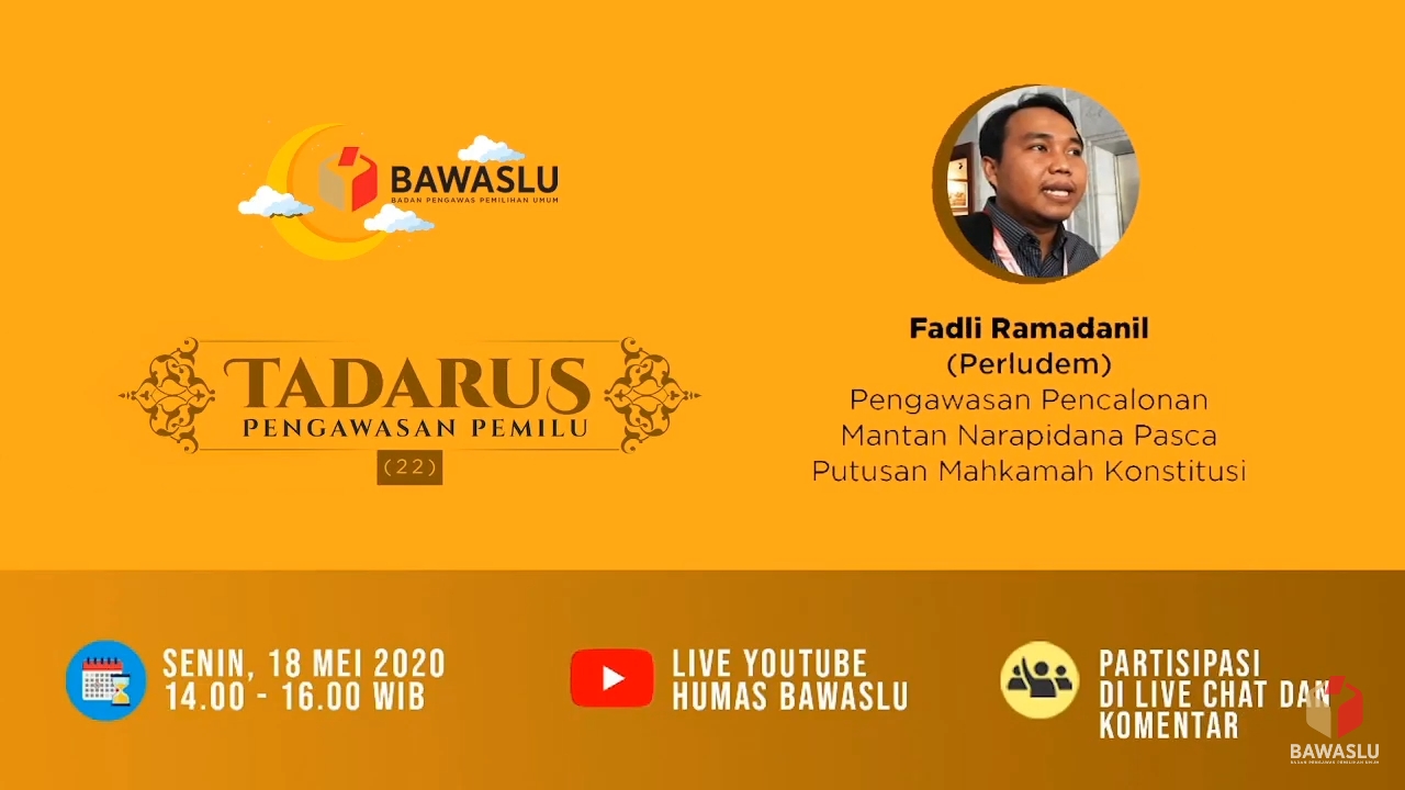 “Hal tersebut merupakan hasil Permohonan uji materi yang diajukan Perkumpulan untuk Pemilu dan Demokrasi (Perludem) dan Indonesia Corruption Watch (ICW) atas Pasal 7 ayat (2) huruf g Undang-Undang Nomor 10 Tahun 2016.” Ungkapnya saat menjadi narasumber Tadarus Pengawasan Pemilu (TPP) Bawaslu RI edisi-22, Senin (18/5).