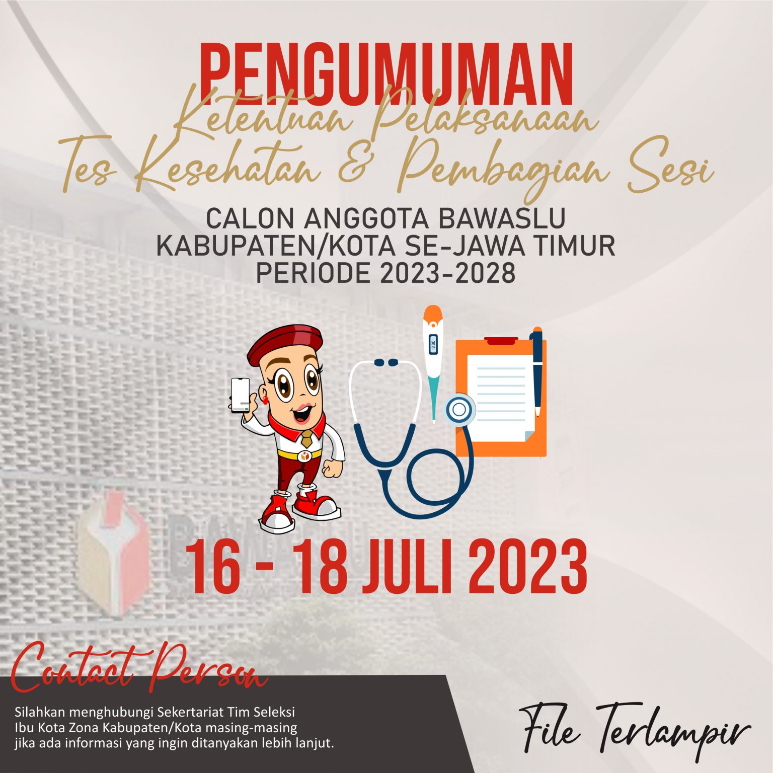 Pengumuman Ketentuan Pelaksanaan Tes Kesehatan dan Pembagian Sesi Calon Anggota Bawaslu Kabupaten/Kota Masa Jabatan 2023-2028