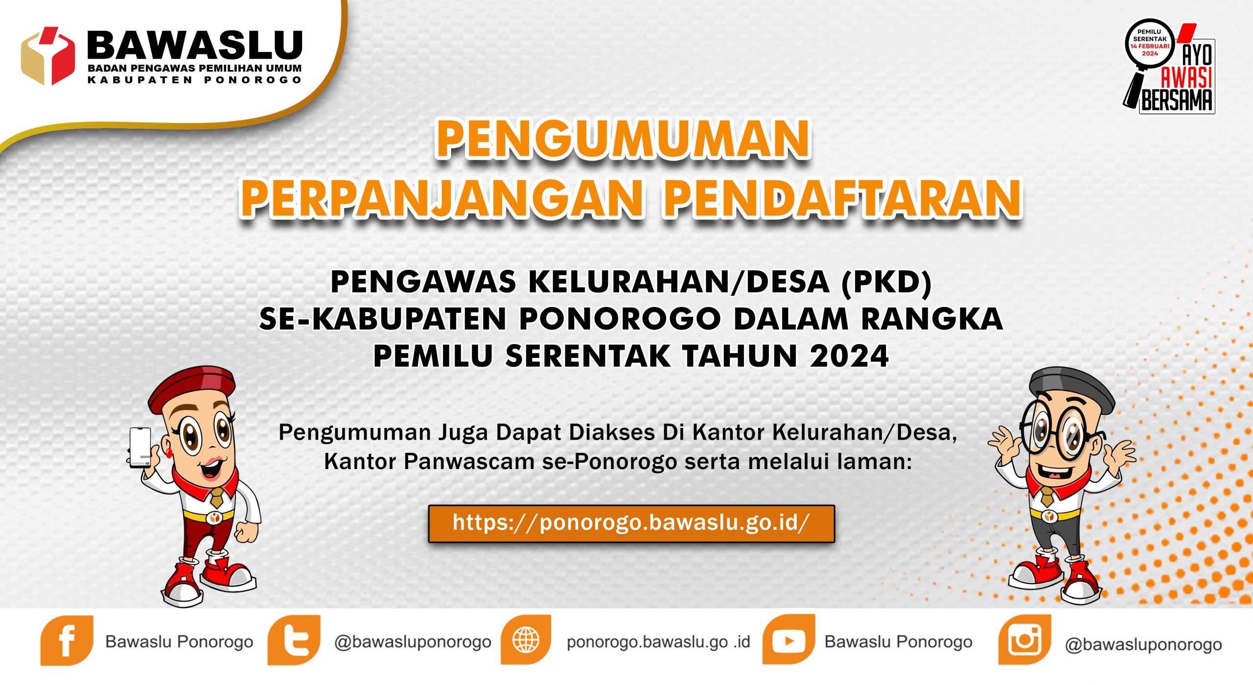 Ponorogo (ponorogo.bawaslu.go.id) Berdasarkan Keputusan Ketua Badan Pengawas Pemilihan Umum Nomor:5/KP.01/K1/2023 Tentang Pedoman Pelaksanaan Pembentukan Panitia Pengawas Pemilihan Umum Kelurahan/Desa (PKD) Pada Pemilihan Umum Serentak Tahun 2024, menyampaikan bahwa perpanjangan masa pendaftaran dilakukan dalam hal: