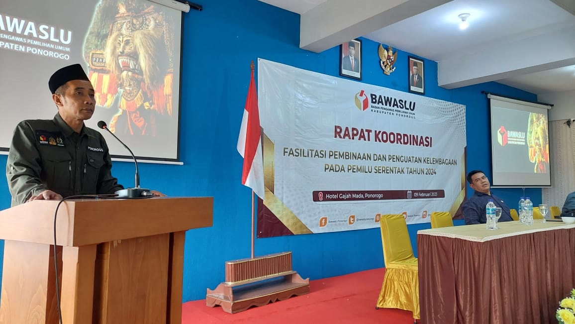 Hal tersebut disampaikan Ketua Bawaslu Kabupaten Ponorogo, Muh.Syaifulloh, saat membuka Rapat Koordinasi Fasilitasi Pembinaan dan Penguatan Kelembagaan Pada Pemilu Serentak tahun 2024 yang diikuti oleh seluruh Anggota Panwascam se-Ponorogo, Kamis pagi (9/2/2023).