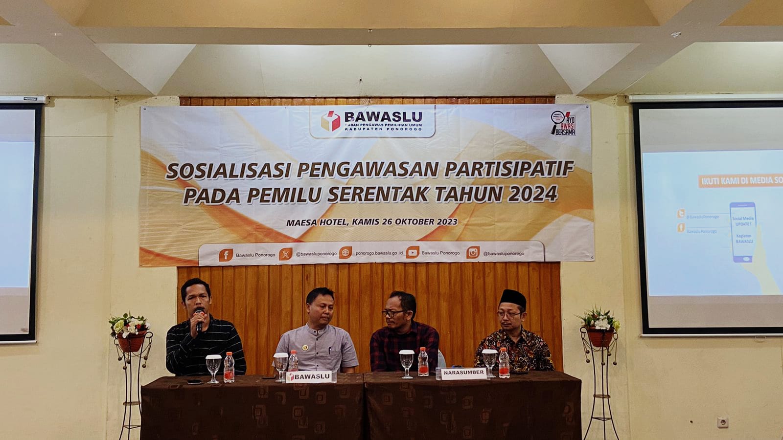 Sebagai informasi turut hadir dalam acara Sosialisasi Pengawasan Partisipatif Pemilu 2024 ini, Ketua Bawaslu Kabupaten Ponorogo M.Bahrun Mustofa serta menghadirkan narasumber, Juwaini selaku jurnalis dan penggiat Pemilu serta Dr.Iswahyudi akademisi IAIN Ponorogo. (Humas).
