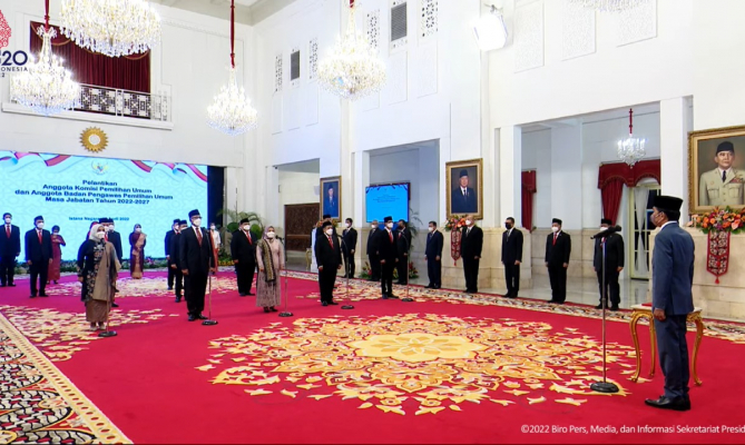 "Bahwa saya akan memenuhi tugas dan kewajiban saya sebagai anggota Komisi Pemilihan Umum, sebagai anggota Badan pengawas Pemilihan Umum dengan sebaik-baiknya sesuain dengan peraturan perundang-undangan, dengan berpedoman pada pancasila dan UUD 1945." Kata Presiden Jokowi saat pengambilan sumpah jabatan anggota Bawaslu dan KPU periode 2022-2027 di Istana Negara.