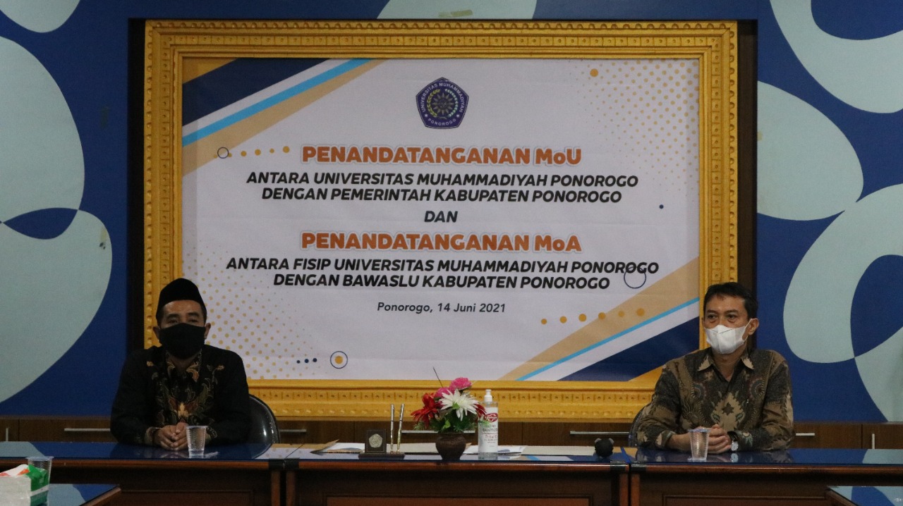 Ponorogo (ponorogo.bawaslu.go.id) Badan Pengawas Pemilihan Umum (Bawaslu) Kabupaten Ponorogo resmi meneken perjanjian kerja sama atau Memorandum of Agreement (MoA) dengan Fakultas Ilmu Sosial dan Ilmu Politik (FISIP) Universitas Muhammadiyah Ponorogo (UMPO), Senin (14/06/2021).