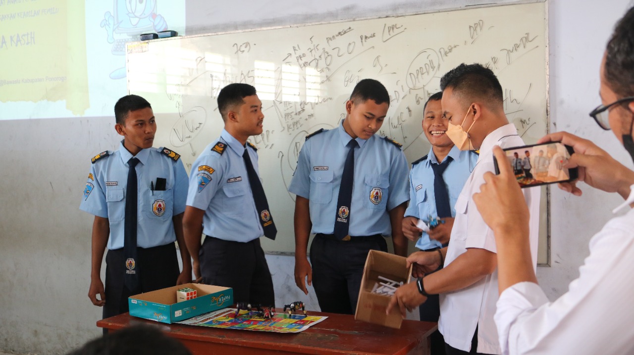 Ponorogo (ponorogo.bawaslu.go.id) Kesepakatan kerjasama atau MoU antara Bawaslu Kabupaten Ponorogo dengan SMK PGRI 2 Ponorogo ditindak lanjuti dengan sosialisasi ke kelas, Rabu (22/11/2021). Kegiatan yang sengaja di format dengan suasana santai dan penuh kemeriahan ini sengaja di buat agar siswa SMK PGRI 2 Ponorogo bisa paham tentang pengetahuan seputar kepemiluan, tugas, kewenangan dan kewajiban Bawaslu. Kelihatan siswa sangat atraktif dalam mengikuti sesi dengan intens bertanya kepada Bawaslu seputar kepemiluan.