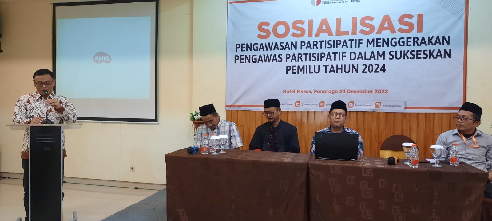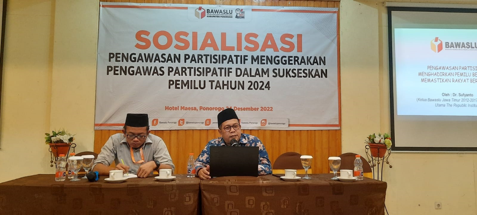 Dr.Sufyanto selaku narasumber dalam Sosialisasi Pengawasan Partisipatif dengan tema Menggerakkan Pengawasan Partisipatif dalam Sukseskan Pemilu 2024, di Hall Maesa Hotel (24/12/2022).