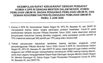 Ponorogo (ponorogo.bawaslu.go.id) Komisi II DPR RI menggelar Rapat Kerja bersama pemerintah dan penyelenggara Pemilu (Bawaslu, KPU dan DKPP) secara tertutup guna membahas rasionalisasi anggaran Pemilihan Kepala Daerah (Pilkada) serentak 2020, Rabu (3/6).