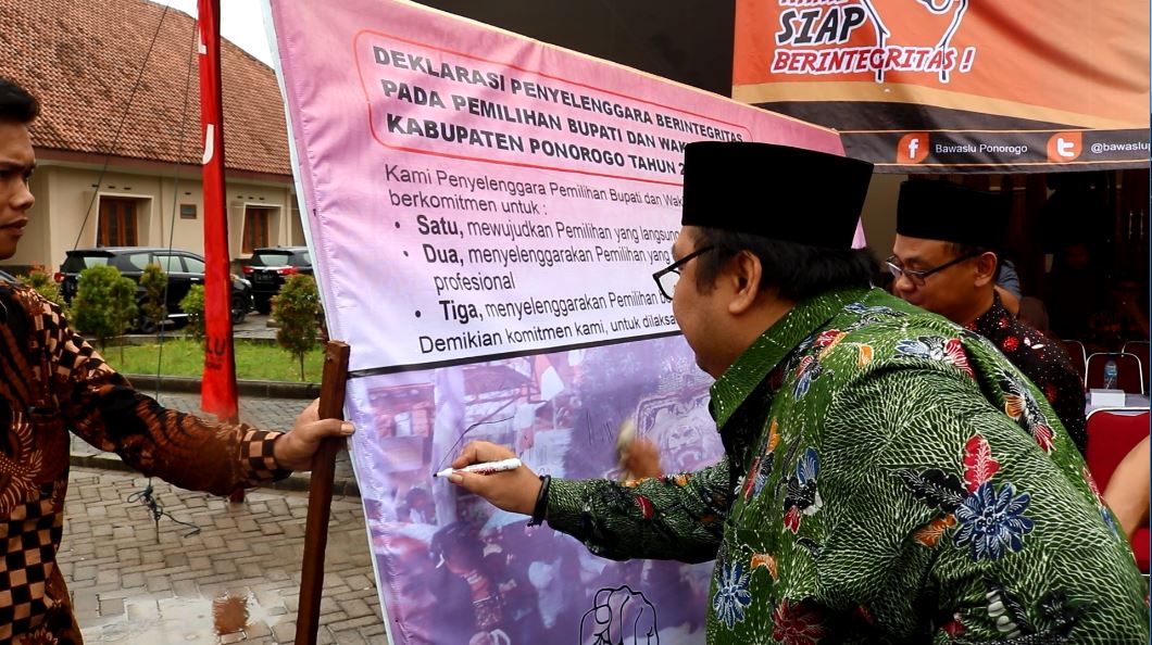 Apel Penyelenggara Berintegritas pada Pemilihan Bupati dan Wakil Bupati Ponorogo oleh Bawaslu Ponorogo, diakhiri dengan penandatanganan prasasti oleh jajaran Bawaslu, KPU, Panwas Kecamatan serta PPK sebagai bentuk komitmen mewujudkan penyelenggara berintegritas.