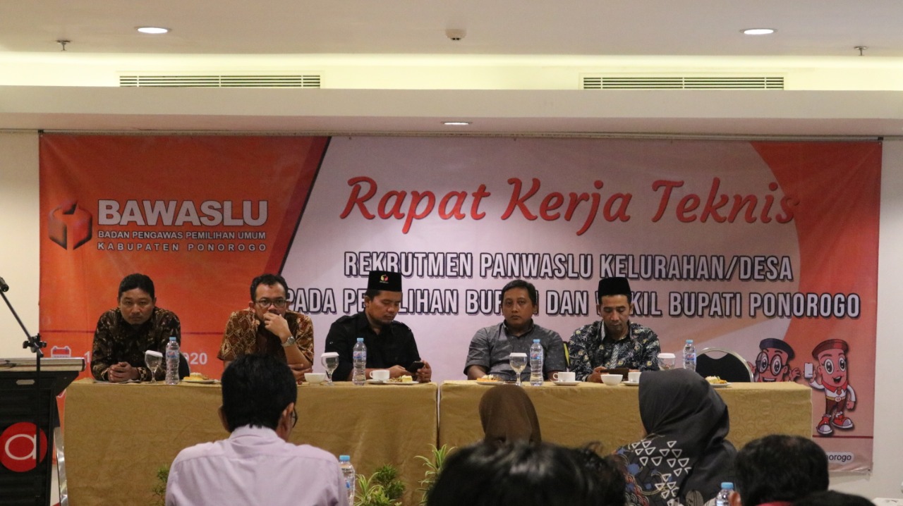 Ponorogo (ponorogo.bawaslu.go.id) Menjelang tahap pendaftaran dan penerimaan berkas calon Panitia Pengawas Pemilihan Umum (Panwaslu) Desa/Kelurahan pada Pilkada 2020, Bawaslu Kabupaten Ponorogo menggelar rapat kerja teknis (Rakernis) dalam rangka peningkatan Sumber Daya Manusia (SDM) Panwas Kecamatan Se Kabupaten Ponorogo.