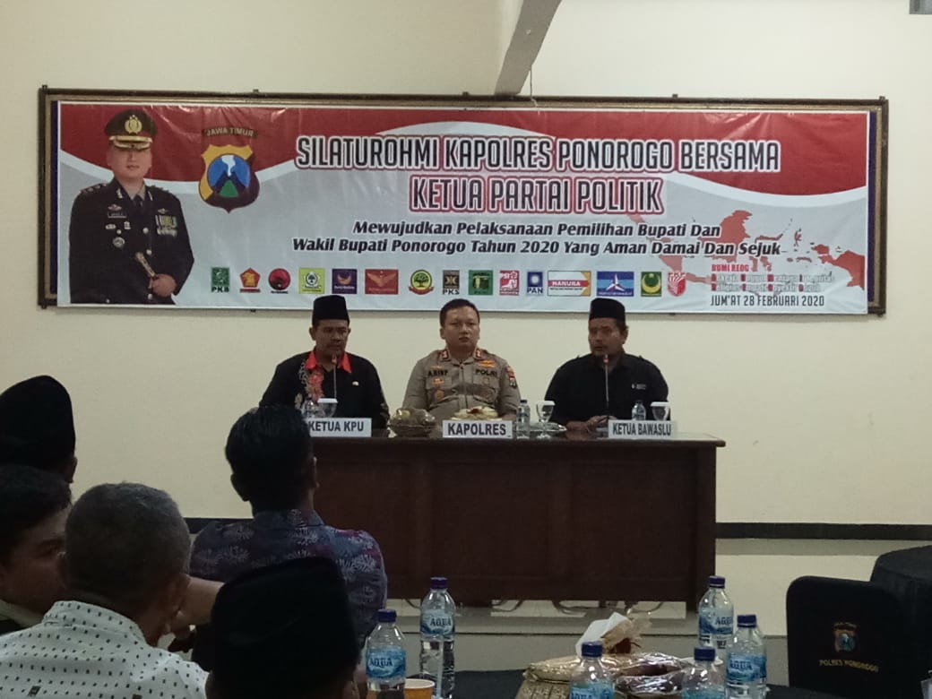 Silaturahmi Kapolres bersama Ketua Partai Politik di Mapolres Ponorogo, selain dihadiri oleh perwakilan partai politik serta Bawaslu, juga dihadiri oleh Arwan Hamidi dari KPU Kabupaten Ponorogo.