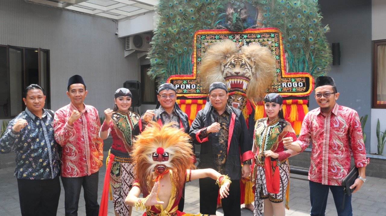 Ketua Bawaslu RI Abhan (tengah) berpakaian penadon bersama Anggota Bawaslu Jawa Timur, Ikhwanudin Alfianto (kiri) disambut kesenian Reyog Ponorogo