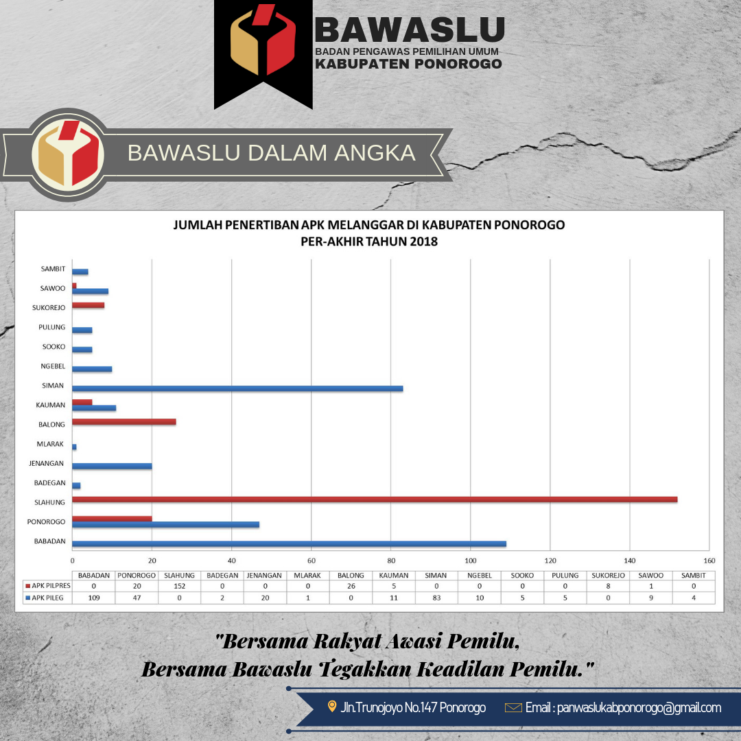 Jumlah Penertiban APK Melanggar Per Akhir Tahun 2018 humas | Selasa, Februari 19, 2019 - 08:38 Tag Hasil Pengawasan Share Berita Terkini humas Kamis, Januari 8, 2026 - 10:22 Perkuat Pengelolaan dan Penataan Arsip, Bawaslu Ponorogo Ikuti Outlook Arsip 2026 Bawaslu Jatim humas Senin, Januari 5, 2026 - 11:35 Bawaslu Ponorogo Gelar Apel Pagi, Tingkatkan Semangat Kerja Awal Tahun humas Kamis, Desember 18, 2025 - 11:29 Jenny Susanto Menghadiri Sosialisasi Pemutakhiran Data Keanggotaan Partai Politik Semester II Tahun 2025 dan Sosialisasi Peraturan KPU (PKPU) Nomor 5 Tahun 2025 tentang Pengganti Antar Waktu (PAW) Lihat Lainnya