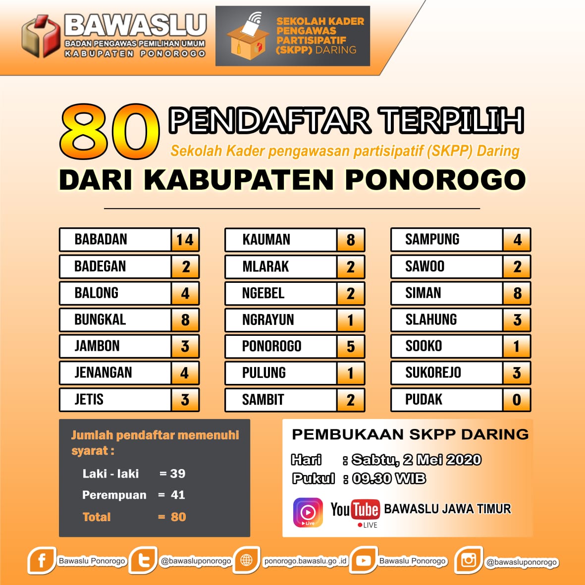 Tercatat sebanyak 80 putra dan putri terpilih dari Kabupaten Ponorogo turut serta dalam program yang dicanangakan oleh Bawaslu RI ini, jumlah tersebut terdiri dari 39 peserta laki-laki dan 41 perempuan.