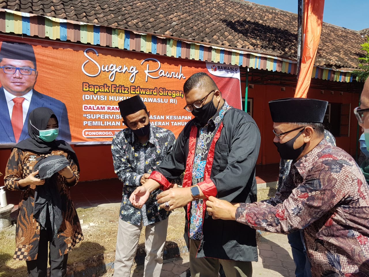 kehadiran Fritz disambut oleh Pimpinan Bawaslu Ponorogo dengan menyematkan pakaian Warog dan Udeng Khas Ponorogo.