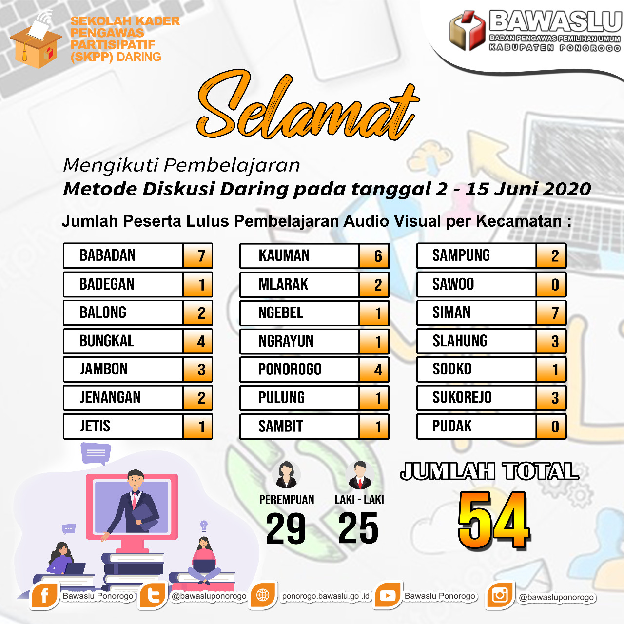 Ponorogo (ponorogo.bawaslu.go.id) Pembelajaran tahap pertama SKPP Daring melalui audio visual telah usai. Tercatat sebanyak 54 peserta dari Kabupaten Ponorogo lolos dalam tahap yang dimulai pada tanggal 2 Mei tersebut.