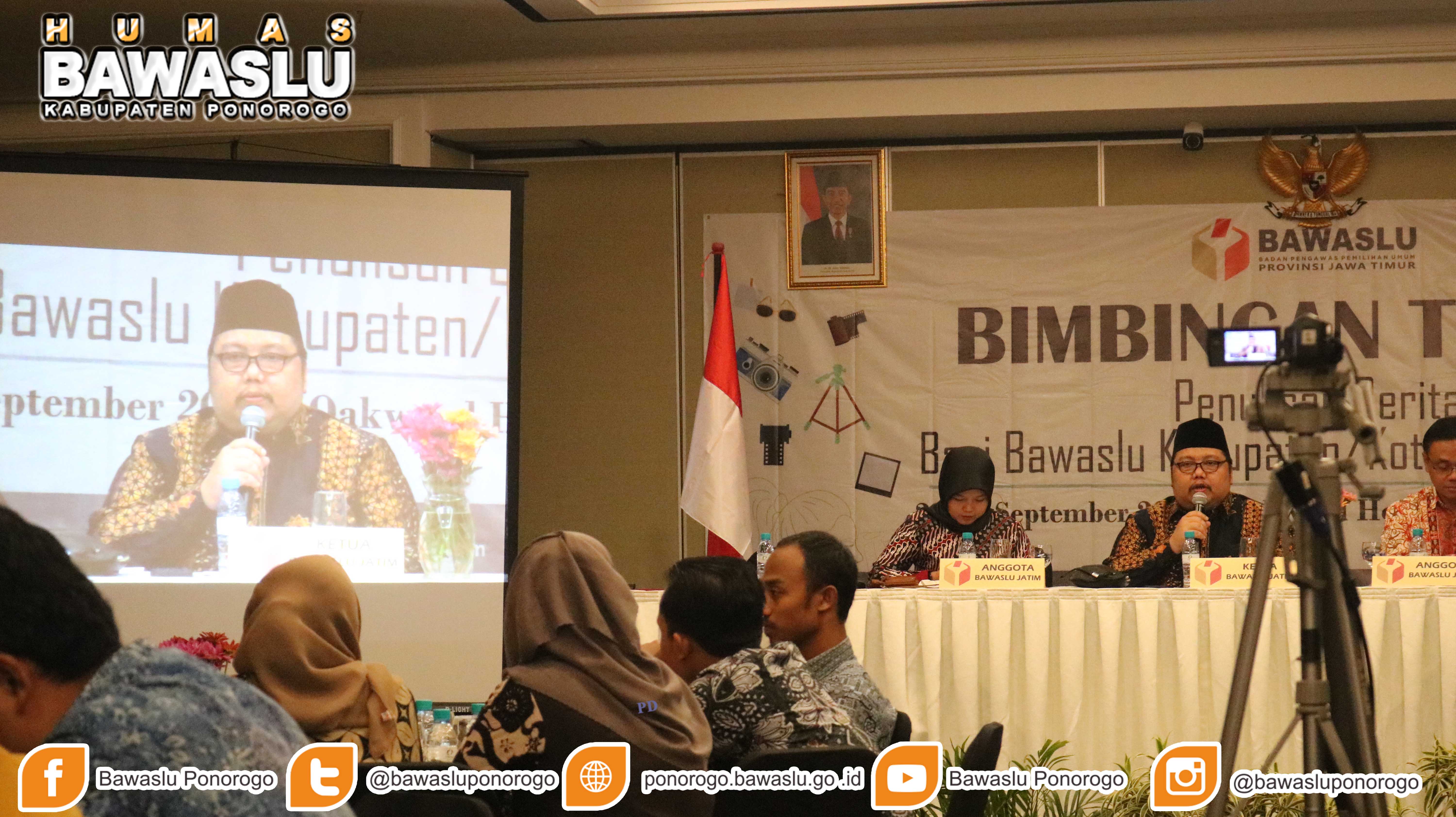 Surabaya (ponorogo.bawaslu.g.id) "Banyak hal yang bisa diangkat menjadi berita tergantung sensitifitas dari jurnalis, hal tersebut dapat dilakukan dengan terus mengasah kemampuan serta yang tidak kalah penting juga adalah mengenai ketepatan waktu penyampaiannya" demikian ungkapan Moh. Amin Ketua Bawaslu Provinsi Jawa Timur pada pembukaan Bimbingan Teknis Penulisan Berita Bawaslu Kabupaten/Kota se Provinsi Jawa Timur, di Oakwood Hotel and Residence (23/10/2019).