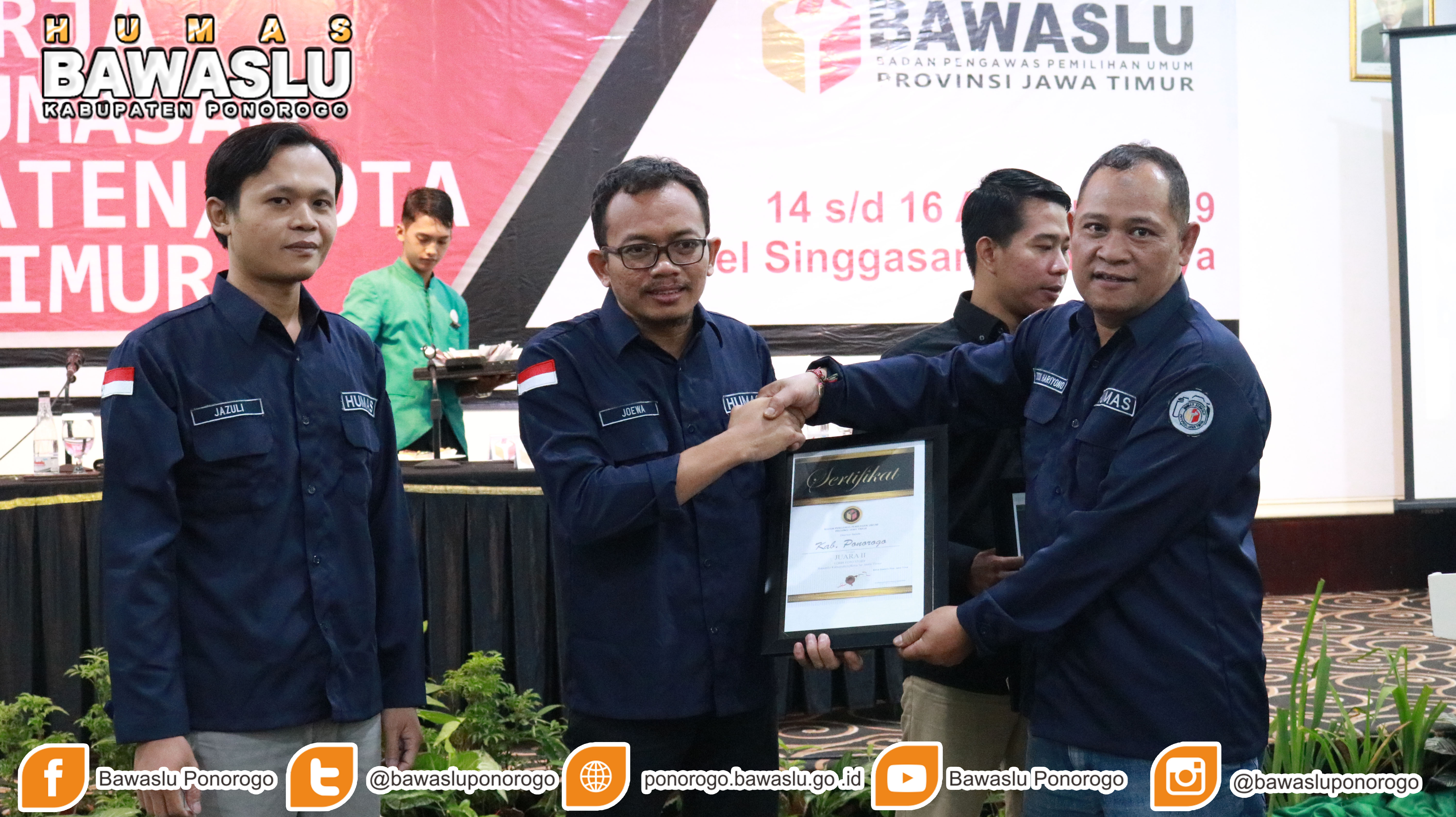 Penghargaan tersebut diserahkan oleh Wakordiv Humas Bawaslu Jawa Timur Totok Hariyoko kepada Juwaini dalam agenda rapat koordinasi kehumasan Bawaslu Provinsi Jawa Timur, Kamis (15/8) di Hotel Singgasana Surabaya.