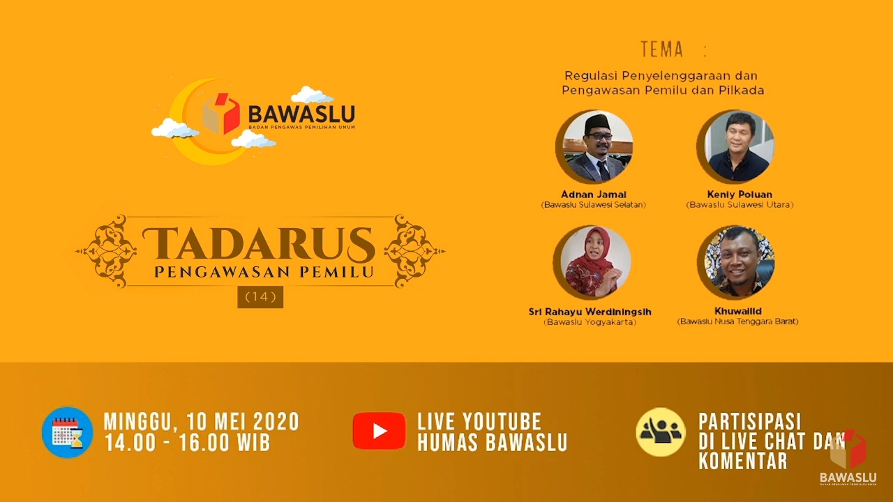 Selain Adnan Jamal dan Sri Rahayu Werdaningsih, Tadarus Pengawasan Bawaslu RI edisi ke 14 ini juga menghadirkan narasumber Kenly Poluan dari Bawaslu Provinsi Sulawesi Utara serta Khuwailid dari Bawaslu Nusa Tenggara Barat, kesemuanya membahas tema besar terkait Regulasi Penyelenggaraan dan Pengawasan Pemilu dan Pilkada, yang disiarkan secara online di Channel Youtube Bawaslu RI.