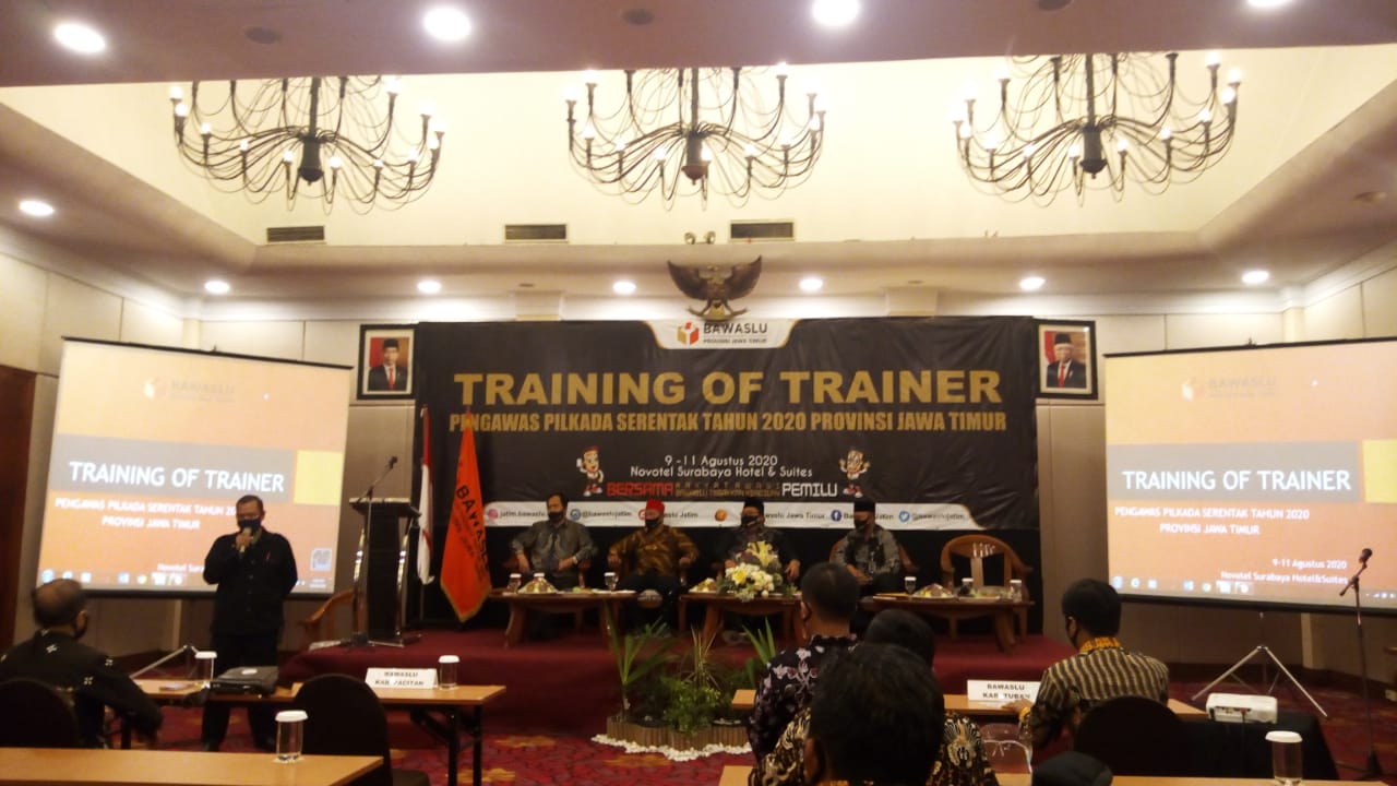 Surabaya (ponorogo.bawaslu.go.id) Menjelang Pemilihan Kepala Daerah Serentak tahun 2020, Bawaslu Provinsi Jawa Timur menggelar training of trainer pengawas Pilkada yang berlangsung selama 3 hari sejak tanggal 9 sampai 11 Agustus 2020, di Novotel Hotel Surabaya.