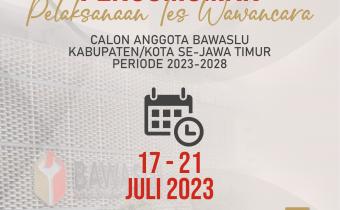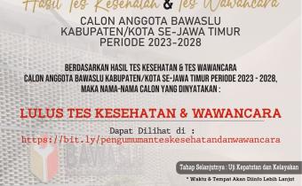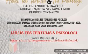 Ponorogo (ponorogo.bawaslu.go.id) Dalam rangka melaksanakan amanat Undang-Undang Nomor 7 Tahun 2017 tentang Pemilihan Umum, setelah melakukan penilaian atas Tes Tertulis dan Tes Psikologi Calon Anggota Bawaslu Kabupaten/Kota Se-Jawa Timur Masa Jabatan 2023-2028, bersama ini kami
